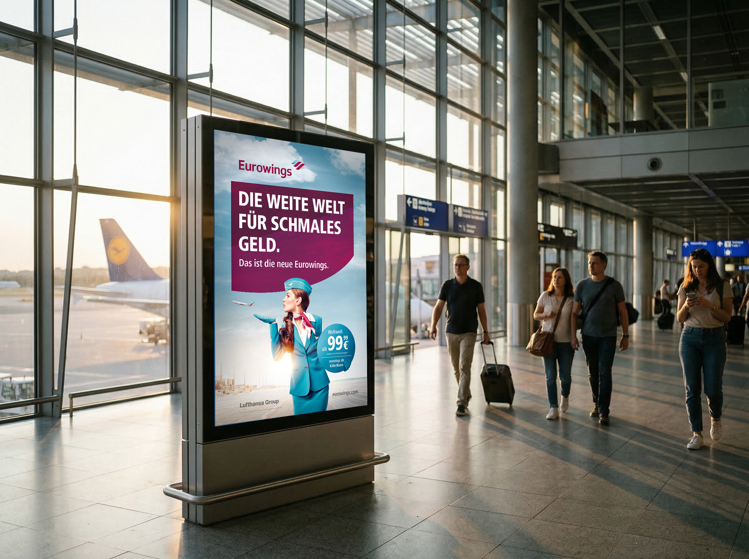 Als neue große Airline möchte Eurowings sich mit ihrer Einführungskampagne ganz klar von ihrem Mutterkonzern Lufthansa abgrenzen und im Low Cost Segment Bekanntheit erlangen, um somit neue Kunden zugewinnen. Durch eine große flächendeckende 360° Kampagne mit medialem Gewicht auf Online, OOH und TV, wird mit allen bekannten Airline Klischees gespielt und klar gemach, dass Eurowings keinen Augenzauber veranstaltet, sondern den Fokus auf dem besten Angebot für seine Kunden legt. Bei einer so erfolgreichen Kampagne mit zahlreichen neuen Kunden und Buchungen, kann man nur absolutely zufrieden sein.